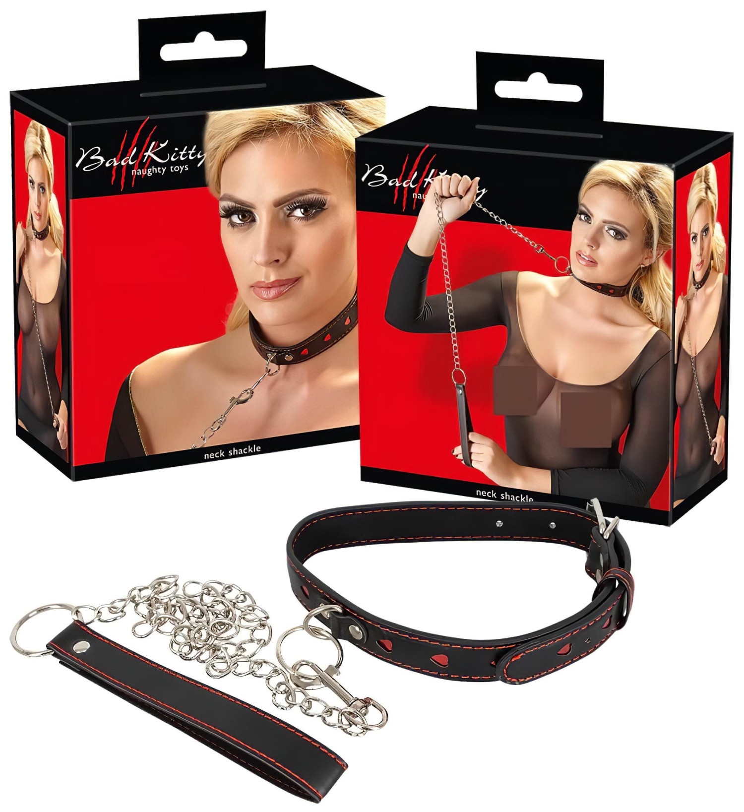 Okořeňte své intimní chvíle tímto romantickým a zároveň divokým setem s obojkem a vodítkem! Obojek s koženým vzhledem a k tomu ladící kovové vodítko jsou skvělý způsob, jak převzít kontrolu a ukázat, kdo je doma pánem.Proč si ho zamilujete?Kvalitní materiál s koženým efektem – stylový a odolný design.Třpytivé srdíčkové motivy a červené prošívání pro krásný vzhled.Kovový D-kroužek a očko pro bezpečné upevnění.Vodítko z kovu s poutkem z umělé kůže – snadno připojitelné.Nastavitelná velikost obojku (35-48 cm) pro pohodlné nošení.Na co si dát pozor:Vždy mysli na pohodlí a hranice svého partnera.Před použitím zkontroluj stav obojku a vodítka.Neutahuj obojek příliš těsně.Jak použít:Obejmi partnerův krk obojkem a nastav velikost pomocí kovové přezky.Připevni kovové vodítko k D-kroužku pomocí malého karabinku.Použij vodítko během hry pro ještě více vzrušení a převzetí kontroly.Co najdete v balení:1× obojek s koženým vzhledem, třpytivými srdíčky a červeným šitím.1× kovové vodítko s poutkem z umělé kůže (délka 78 cm).Vlastnosti produktu:Šířka obojku: 2,5 cm.Obvod obojku: nastavitelný mezi 35-48 cm.Délka vodítka: 78 cm.Materiál: Polyuretan, kov.Barva: černý obojek s červenými detaily, kovové části ve stříbrné barvě.Doporučení pro čištění: Očisti obojek a vodítko vlhkým hadříkem. Po uschnutí skladuj na suchém, chladném místě, mimo přímé slunce.