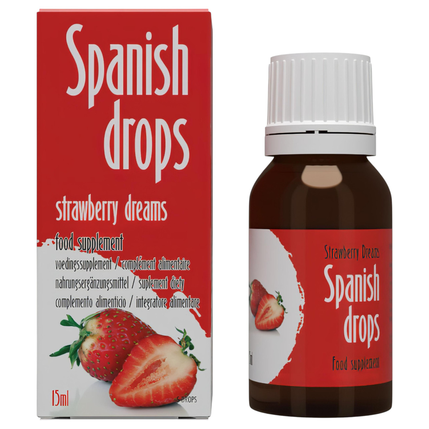 Cobeco Spanish Drops – afrodiziakální kapky s nádechem sladké jahody pomáhají zvýšit touhu a erotické vzrušení pro ještě intenzivnější chvíle.Proč jsou Cobeco Spanish Drops Strawberry Dreams – afrodiziakální kapky dobré?Tento ochucený tekutý afrodiziakum rychle vstřebává a působí v krátkém čase. L-arginin podporuje prokrvení intimních oblastí, zatímco vitamin C přispívá ke správné funkci nervového systému a zvýšení energetické hladiny. Výsledkem je zvýšená touha, větší potěšení a dlouhotrvající erotické napětí.Proč zákazníci milují Cobeco Spanish Drops Strawberry Dreams – afrodiziakální kapkySenzuální jahodová chuť: lákavě sladký, romantický zážitek.Přirozené zvyšování touhy: aktivuje vlastní energii těla.Obsah L-argininu: podporuje sexuální výkon.Obohaceno vitaminem C: podporuje vitalitu a vytrvalost.Unisex formule: ideální pro ženy i muže.Intenzivnější erotické napětí: zvýšená touha a vzrušení.Obsah balení1 ks Cobeco Spanish Drops Strawberry Dreams afrodiziakální kapky (15 ml)Vlastnosti produktuTyp: afrodiziakální kapkyBalení: 15 mlChuť: jahodaPoužití: unisexDávkování: 3 ml (cca 15 kapek)Hlavní účinná látka: L-argininDoplňková složka: Vitamin CJak používatPřijměte 3 ml (cca 15 kapek) přímo pod jazyk a polkněte přibližně 30 minut před stykem. Nepřekračujte doporučenou denní dávku.Složení (v 3 ml dávce)VodaL-Arginin: 40,5 mg *Vitamin C (kyselina L-askorbová): 15 mg (18,75% RI)AromaKonzervanty: E211, E202*RI = referenční hodnota příjmuNa co dávat pozor při použití Cobeco Spanish Drops Strawberry Dreams – afrodiziakálních kapek:Nepřijímejte více než 3 ml během 24 hodin.Nepřekračujte doporučenou denní dávku.Při citlivosti přestaňte používat.Není náhradou za vyváženou stravu a zdravý životní styl.Uchávejte mimo dosah dětí.Skladujte na suchém a chladném místě pro zachování kvality.