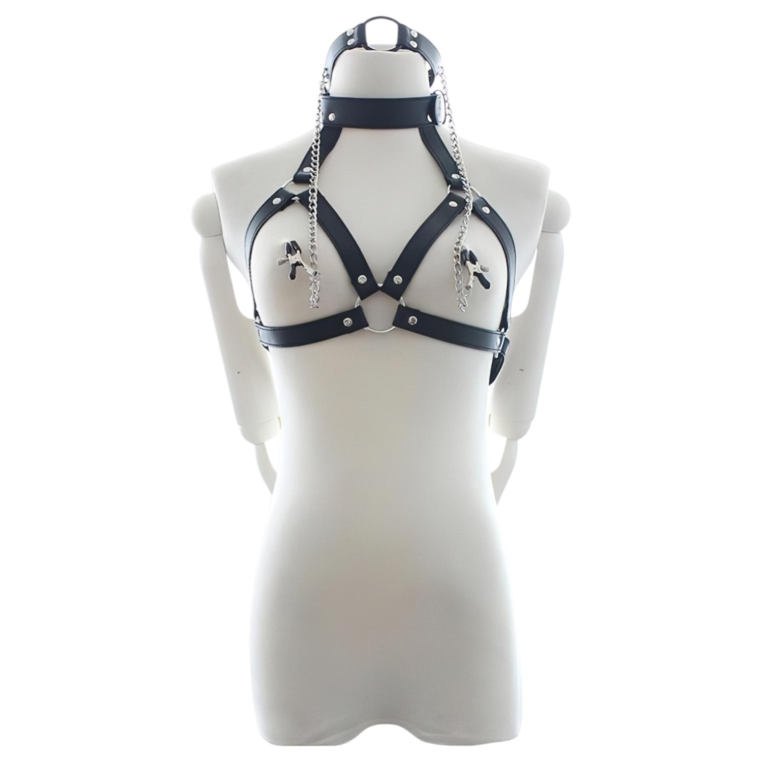 Latetobed – postroj s roubíkem a svorky na bradavky (černý)