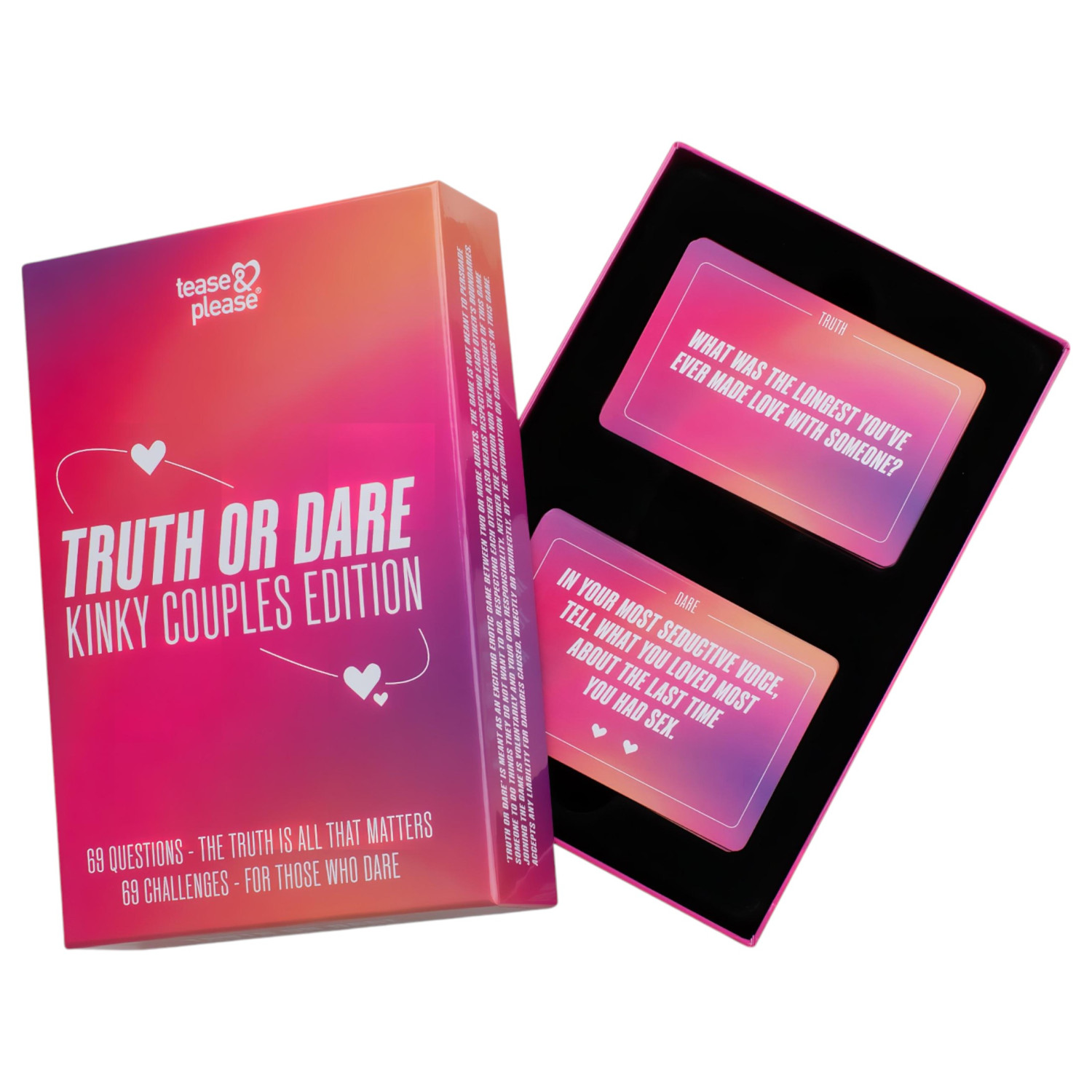 Dopřej si trochu odvahy a vzrušení – tahle hra rozproudí atmosféru a vnese do vašeho vztahu nový level intimity!Proč si ji užít?Prohloubí vaši blízkost a utuží partnerské pouto.69 pikantních otázek a 69 odvážných výzev se postará o zábavu a pestrost.Hra je ideální pro páry, ale dá se užít i ve společnosti dalších párů, když chcete ještě žhavější zážitek.Na co si dát pozor:Během hry je důležité být upřímný a otevřený.Každý by měl respektovat hranice a pohodlí toho druhého.Ujistěte se, že máte klidné a příjemné prostředí ke hraní.Jak na to?Položte balíček karet doprostřed stolu.První hráč si vytáhne kartu a rozhodne se, jestli zvolí „pravda“ nebo „výzva“.Odpoví na otázku nebo splní úkol, pak pokračuje další hráč.Při párové nebo skupinové hře můžete do splnění výzev zapojit i ostatní.Obsah balení:Balíček karet se 69 otázkami a 69 výzvamiPravidla hryParametry produktu:Počet karet: 138 ksJazyk: angličtinaVelikost balení: cca 10 x 7 x 3 cmMateriál: kvalitní karton