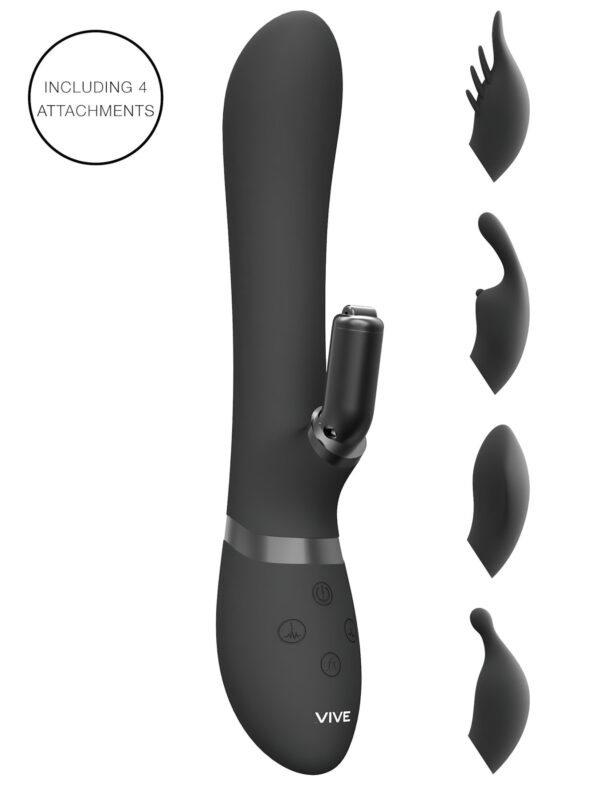 Vive přichází s úplně novým setem vibrátoru s ramínkem na klitoris, ke kterému dostaneš hned 4 vyměnitelné hlavice na dráždění klitorisu! Proč si ho zamiluješ? Ideální pro ženy, které dosáhnou orgasmu jen kombinací vaginální a klitoriální stimulaceErgonomický, rozšířený a mírně zahnutý tvar – perfektně sedne na G-bodHebký, příjemný materiál, který je šetrný i k citlivé pokožceMírně ohebný design – oba konce jsou flexibilníDva extra silné motory – intenzivní stimulace zároveň na klitorisu i G-bodu2 x 10 vibračních režimů – vybiráš z deseti možností jak pro vaginu, tak pro klitorisMotory můžeš ovládat samostatně4 vyměnitelné hlavice na klitoris – zajíček, křidélka, jazýčky a hlavice do bodu – vyzkoušej všechny a objev své oblíbené orgasmické zážitky!Orgasmická funkce – jedním tlačítkem spustíš vysoké otáčky obou motorů naráz100% vodotěsný – užívej si tvoje dobrodružství i ve vaně nebo spršeVestavěná baterie – žádné shánění baterekNa co si dát pozor: Pro mazání používej pouze lubrikant na vodní báziPřed každým použitím i po něm důkladně omyj a vydezinfikujPři skladování drž jednotlivé části od sebe a od ostatních hračekJak na to? Po použití lubrikantu zasuň vibrátor do vaginy tak, aby ramínko na klitoris směřovalo nahoru k tobě.Začni malými pohyby dovnitř a ven, až potom pronikni úplně a nastav ramínko, aby pěkně sedělo na venušin pahorek.Pokud chceš ještě silnější stimulaci klitorisu, roztáhni stydké pysky, aby ramínko bylo v přímém kontaktu s klitorisem.Pak už můžeš libovolně přepínat mezi vibračními režimy.Střídej hlavice na klitoris a zjisti, která ti nejvíc sedí: zajíček – klasická rabbit hlavice, jeho ouška tě nikdy nezklamoukřidélka – boční křidélka sedí na venušin pahorek a přenáší vibrace až tamjazýčky – čtyři jazýčky nad sebou, které ti rozproudí úplně novou extázibodová hlavice – zaměří vibrace přesně na jeden bodOvládání: Najdeš tu čtyři tlačítkaHorní (power) dlouze podrž pro zapnutí/vypnutíV pohotovostním režimu, levé tlačítko (vlnka 1) krátce stikni pro spuštění a přepínání režimů vibrace ramene pro G-bod, podrž pro vypnutíV pohotovostním režimu, pravé tlačítko (vlnka 2) krátce stikni pro spuštění a přepínání režimů vibrace ramene pro klitoris, podrž pro vypnutíSpodním (fx) tlačítkem můžeš zapnout/vypnout orgasmickou funkci – oba motory pojedou na plný výkonPřipojení nabíjecího kabelu: Nabíjení je naprosto jednoduché díky magnetickému USB kabelu v balení. Nabíjecí kontakty najdeš na zadní straně stimulátoru (proti tlačítkům) jako dva malé kovové body. Balení obsahuje: 1x vibrátor1x magnetický USB nabíjecí kabel4x vyměnitelná hlavice na klitoris (zajíček, křidélka, jazýčky, bodová)Specifikace produktu: sametově hebký povrchanatomicky tvarovanýfunkce vibrátoru na klitoris i G-bod zároveňvyměnitelné hlavice na klitoris (4 ks: zajíček, křidélka, jazýčky, bodová hlavice)2 vibrační motory2 x 10 vibračních režimůsamosatné ovládání motorůorgasmická funkce100% vodotěsný (IPX7: až 30 minut do 1 metru)snadná údržbavestavěný lithium-polymer akumulátordoba nabíjení: 180 minutdoba použití: 40 minutmaximální hlučnost: 60 dBpohodlně umístěná tlačítka přímo na přístrojicelková délka: 22 cmmaximální průměr: 3,5 cmdélka pro zavedení (po ramínko): 12,5 cmdélka ramínka na klitoris: cca 7,5 cm (dle hlavice se mění)průměr ramínka: cca 2,5 cm (dle hlavice se mění)barva: růžovámateriál: ABS, silikon (v souladu s EU normami, bez ftalátů)Doporučení k čištění: Pečlivě omyj jemným mýdlem a vlažnou vodou, opláchni a nech oschnout. Ideálně používej speciální čistič na erotické pomůcky (8718627520062) – lze dokoupit zvlášť.