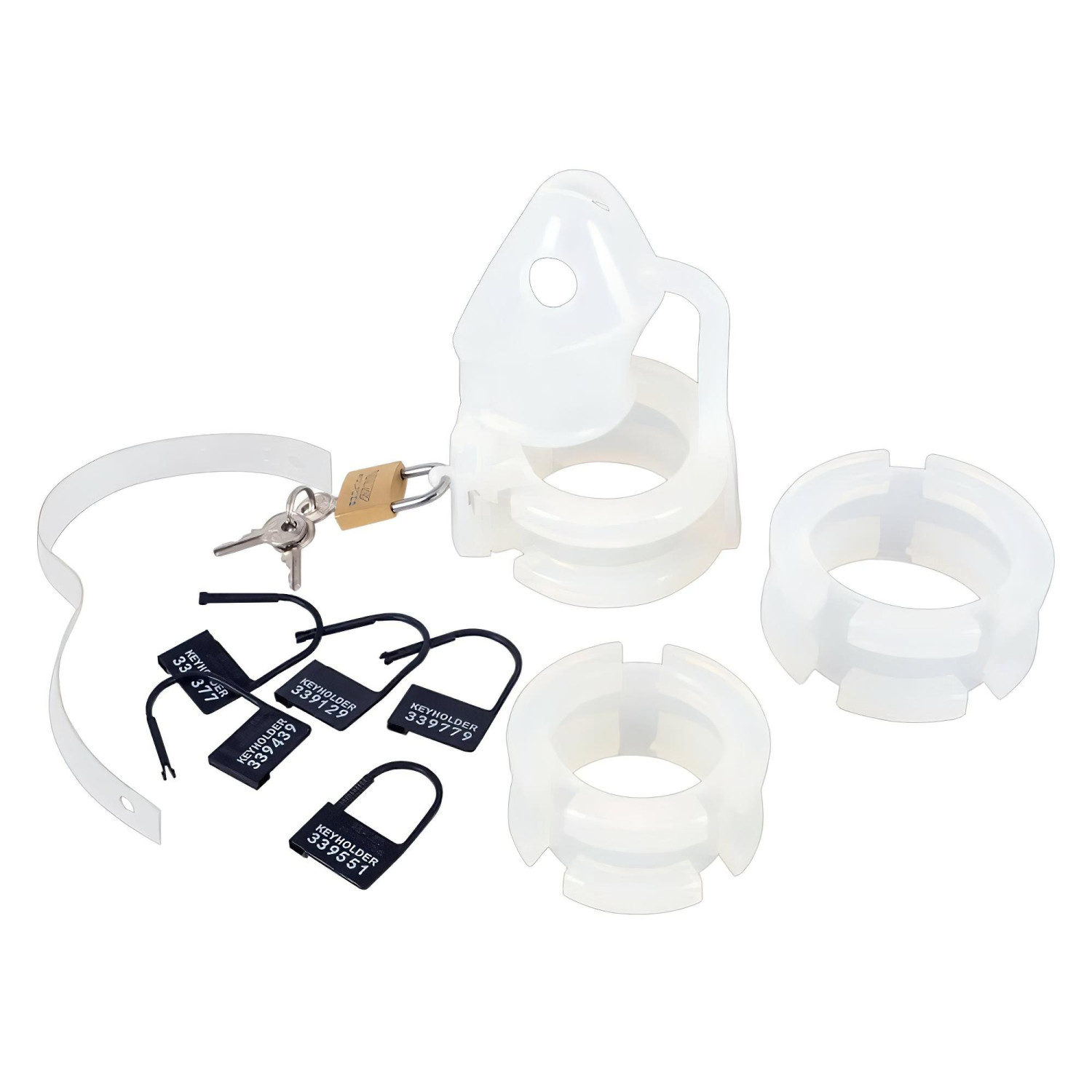 Uzamkni touhu do klece s tímto kompaktním silikonovým pánským páskem cudnosti a vychutnej si vzrušující hrátky plné napětí! Proč je to super?Měkký, pružný silikon – pohodlný na nošení i při delším používáníKompaktní design – diskrétní, pohodlný a efektivní pro zvýšení vzrušeníTři různé velikosti kroužků na varlata – snadno si vybereš, co ti nejlíp padneDá se zamknout kovovým zámkem nebo plastovými plombami – bezpečné uzamčeníJednoduché nasazení – snadné používání a přitom účinné zamčeníSkvělé pro předehru, zvýšení touhy i dominantní hryVyrobeno z materiálů odpovídajících evropským normám, bez ftalátůNa co si dát pozor:Před i po použití důkladně omyj klec i kroužkyPři dlouhodobějším nošení občas zkontroluj pohodlí a prokrveníPokud uzavíráš zámkem nebo plombou, nepoužívej lubrikant – klouzavý povrch by mohl znesnadnit bezpečné zamčeníJak na to?Vyber si správnou velikost kroužku na varlata a nasuň ho až ke kořeni penisu a varlat. Pak protáhni silikonovou smyčku skrz poutka klece, vlož penis do klece a smyčku provlékni skrz podélné otvory, natáhni ji až za varlata. Nakonec vlož zavírací kolík a zajisti ho přiloženým zámkem nebo plombou, aby všechno drželo na místě.Balení obsahuje:1x silikonová klec na penis s páskem3x pružný kroužek na varlata (průměry: 4,1 cm, 4,8 cm, 5,2 cm)1x kovový zámek se 2 klíči5x číslovaná plastová plomba1x zavírací kolíkVlastnosti produktu:vnitřní délka: 7 cmvnitřní průměr: 3,5 cm (pružný)průměry kroužků na varlata: 4,1 cm, 4,8 cm a 5,2 cm (pružné)šířka kroužků: 3,2 cmbarva: klec bílá, zámek zlatý, plomby černémateriál: ABS, kov, silikon (bez ftalátů, v souladu s EU normami)